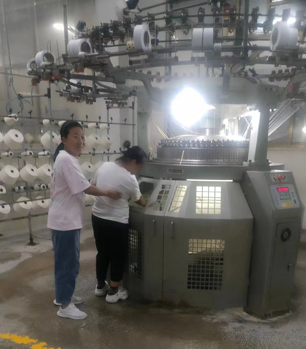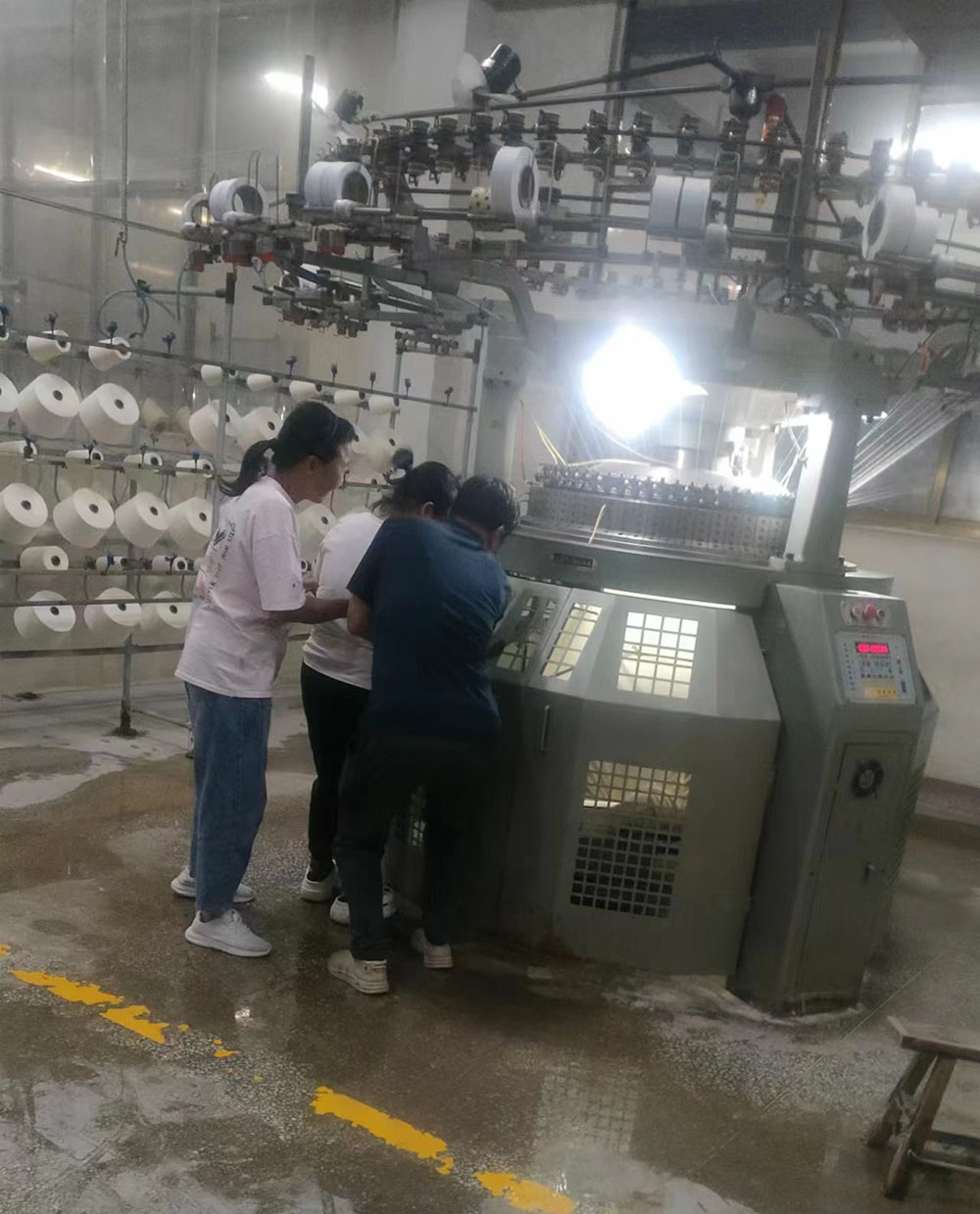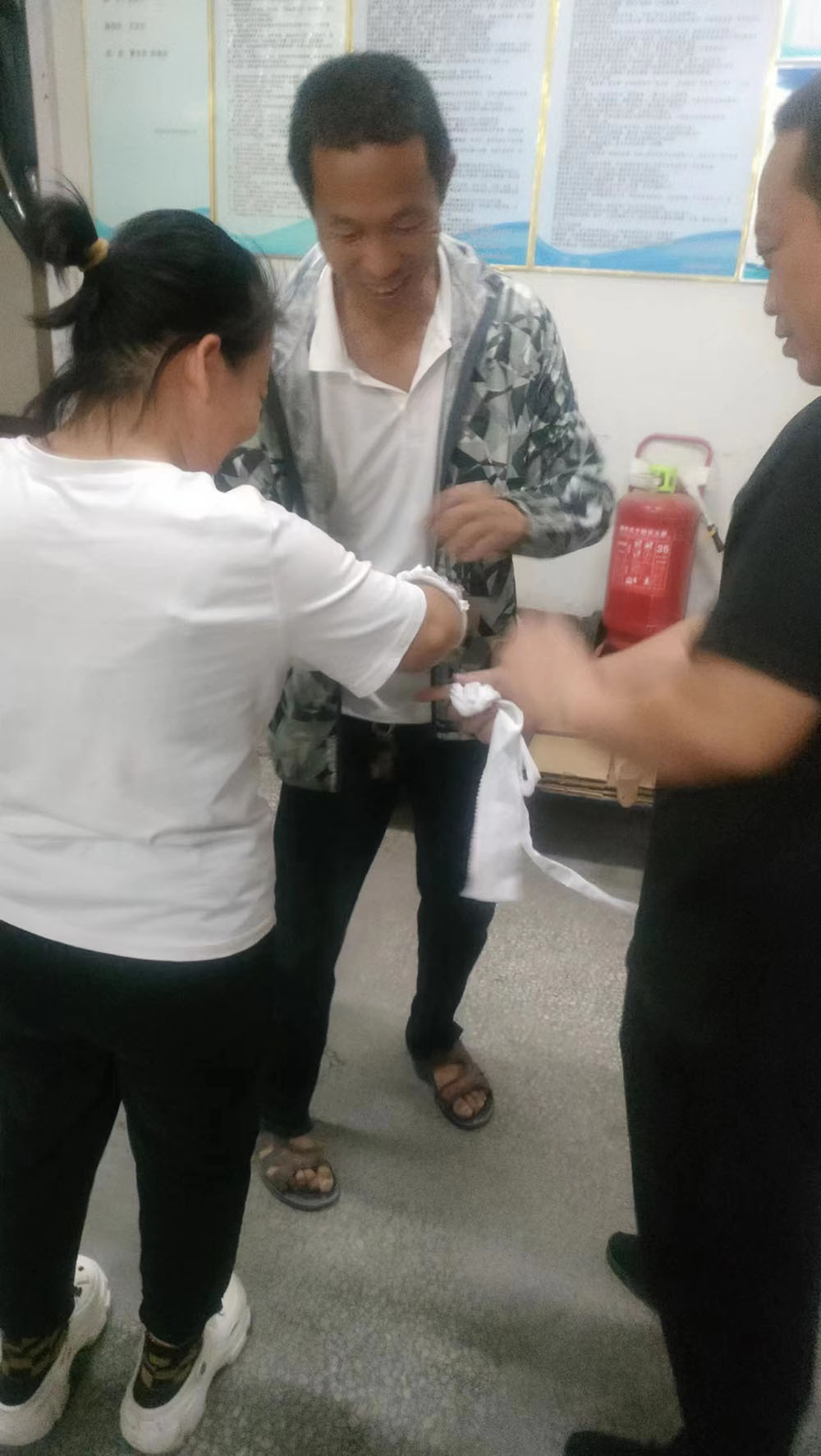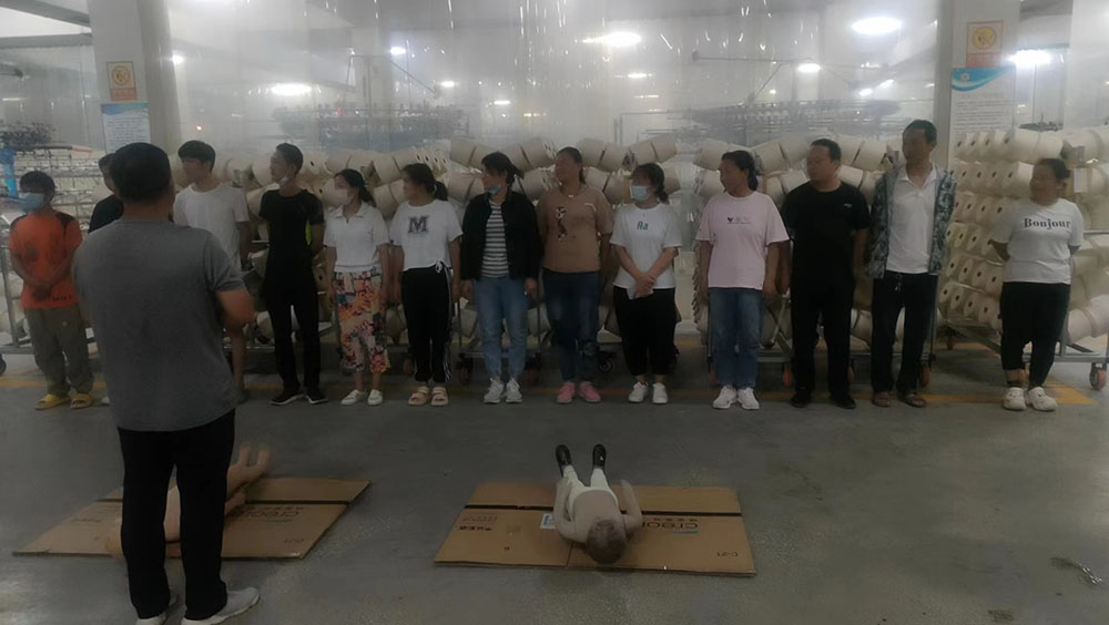 首先,模拟车间生产现场出现机械伤害事故,有员工被卷入大圆机中受伤,马上启动应急预案。各应急小组紧张地投入到应急救援工作之中,抢救伤员、救护包扎、紧急联络,各项工作有序展开。救援小组立即关停机器,将受伤员工从机器中抢救出来。救护小组给伤员检查伤情,包扎止血。联络小组打120请求派救护车紧急救护,受伤员工得到了及时救治。